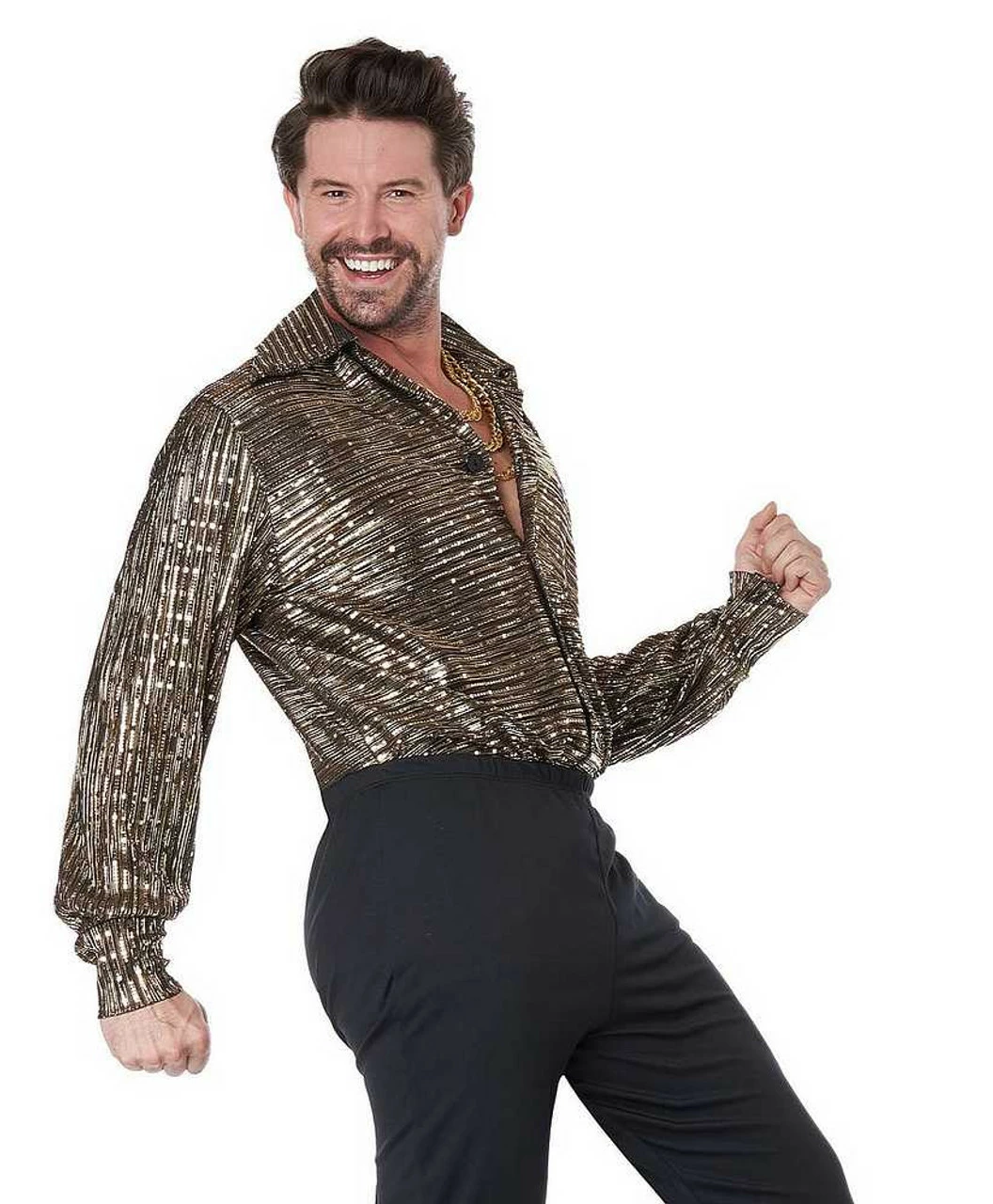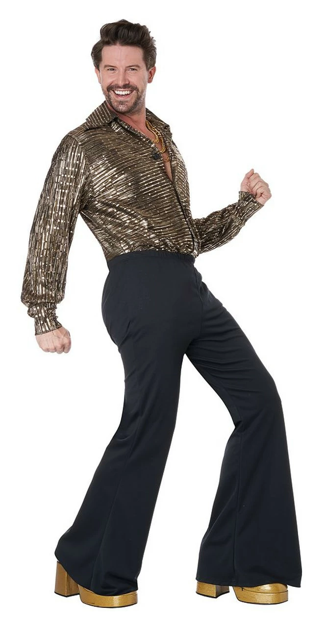 Boogie woogie and dance until the dawn under the lights of the disco ball with this 70’s Disco Guy Golden Costume! It features a loose, gold shirt with a large collar and black flared pants. Complete the costume with a wig and chuncky necklaces (not included) for the full Disco look! The 70’s Disco Guy Golden Costume includes: *Shirt *Pants *Shoes and necklaces NOT included