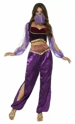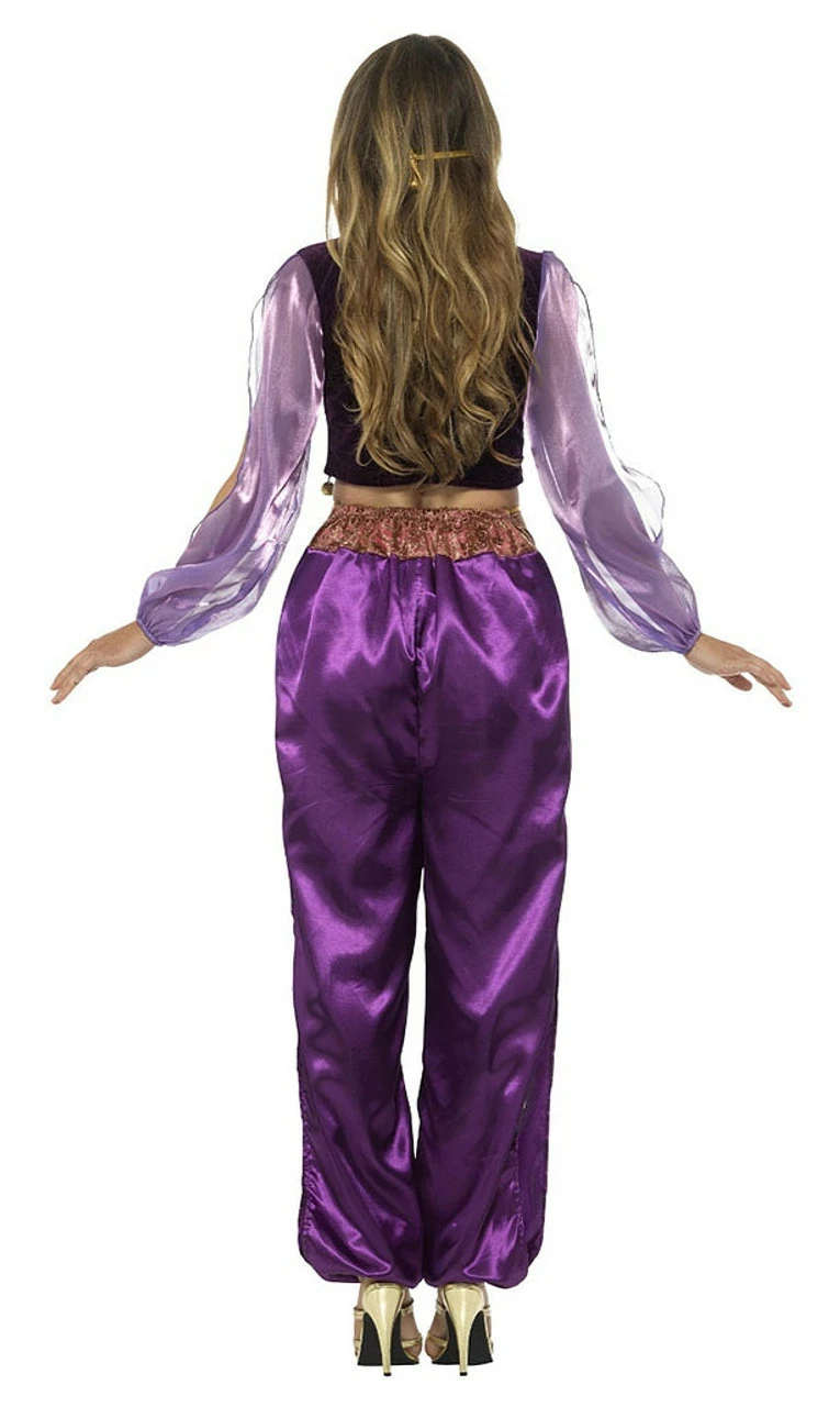 Your wishes will come true with this Arabian Princess Woman Costume! You’ll become a magical being and charm everyone around you with this stunning costume, which features purple pants with a gold lace and coin trim, a purple crop top with a gold coin trim and sheer purple sleeves, as well as a matching face veil.