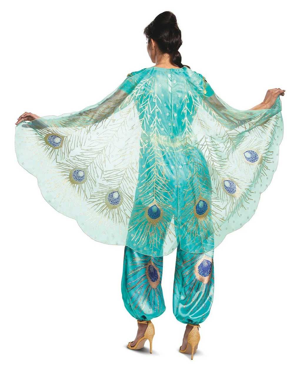 Are you ready to discover a whole new world? Straight out of the new Aladdin movie, this beautiful, officially licensed Jasmine Teal Deluxe Adult Costume includes features a gorgeous teal jumpsuit with golden ornaments on the top and a peacock feather pattern on the pants and on the semi-sheer detachable cape. The attached gems on the jumpsuit will truly have you feeling like royalty!