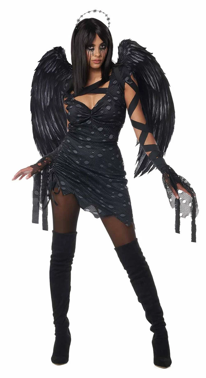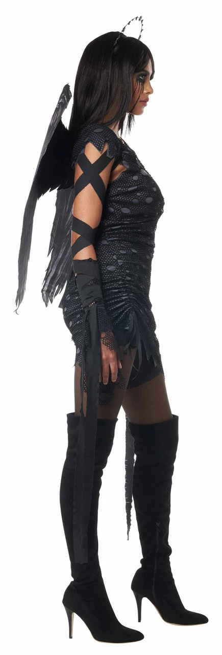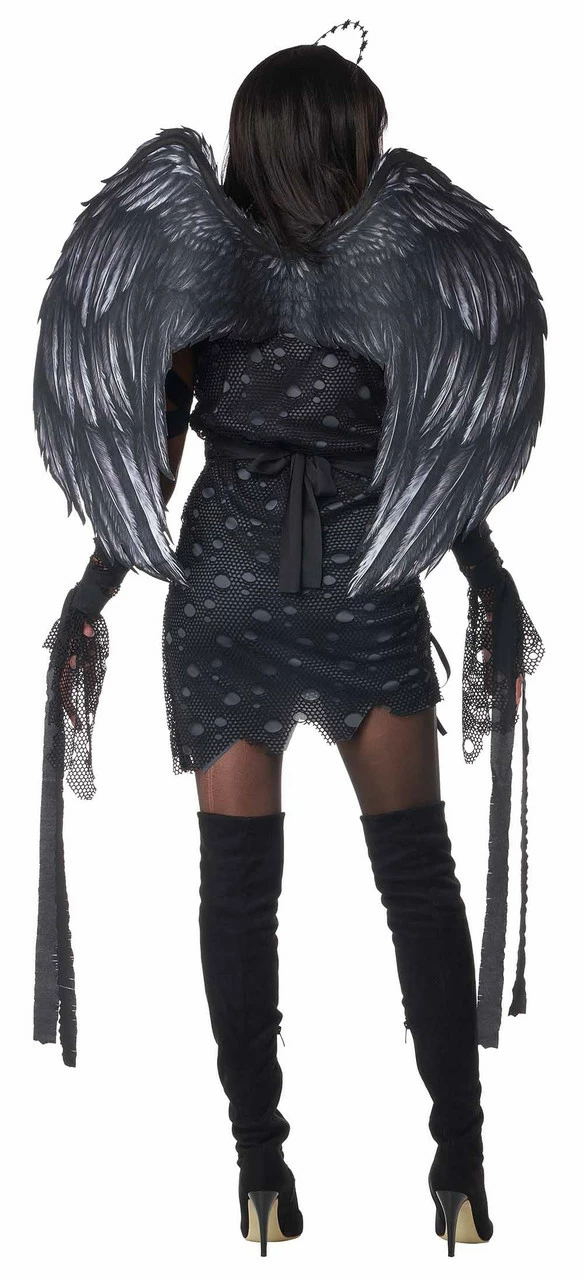 Stand out this Halloween by becoming the dark angel in this Angel of Darkness Women Costume! It features a dark gray short sexy sleevelss dress with uneven trims and a ripped black overlay, a beautiful dark silver starry halo, big beautiful feather wings. The matching glovelettes and arm ties add to the dramatic and yet sexy look of this costume. Now you can decide if you want to stay on earth or fly in the skies!Â