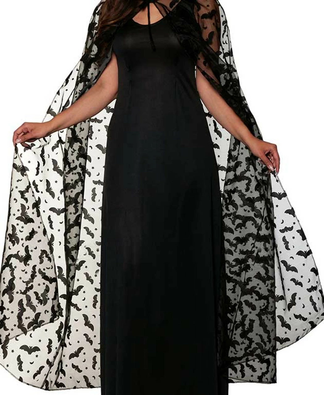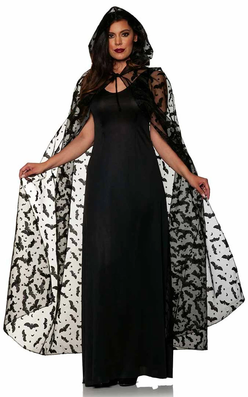 Charm the night away with this amazing Bat Cape Woman Costume! This luxurious accessory features a see-through black cape with little bats printed everywhere, and an attached hood for a sleek look.Â