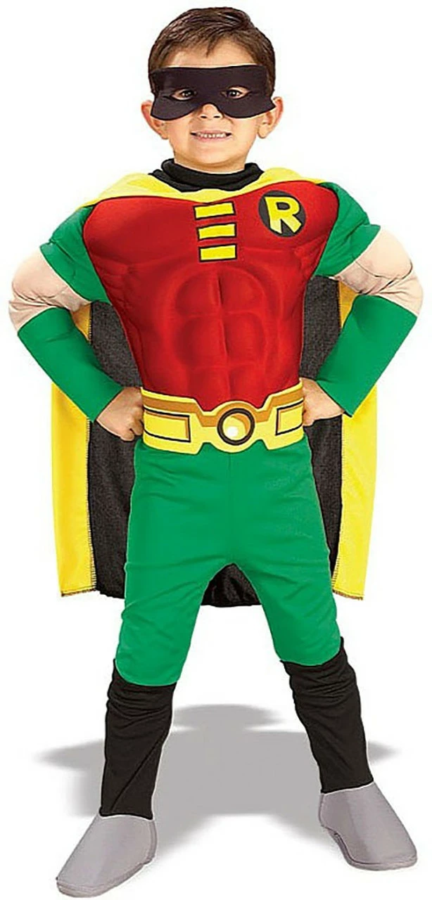 From the DC Comics superhero team, Robin Muscle Deluxe Costume will help transform your little tyke into his favourite teenage superhero. The Teen Titan Deluxe Robin Costume features an attractive muscle chest jumpsuit in Robin’s trademark colors , yellow and green, with touches of red and black here and there. A groovy black-and-yellow cape, an eye mask, a stylish belt, and snazzy boot tops are included. Help him play the superhero role to the max with the Teen Titan Deluxe Robin Costume.