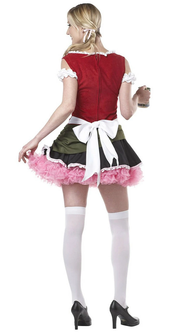 Check out this sexy Bavarian Bar Maid Costume – a colorful mini dress that has a white sweetheart neckline and puff sleeves, striking red body with floral trims and ribbons, and a ruffled multilayer skirt with pink petticoat and attached white apron. This lovely Bavarian Bar Maid Costume comes complete with complimentary pink hair bows. Definitely chic and charming!