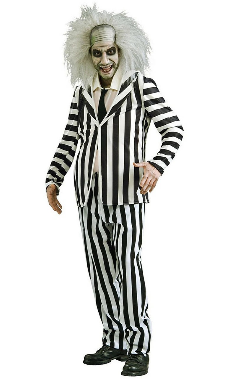 Scare away annoying people with this eerie Beetlejuice costume! This outfit includes the black and white vertical stripes jacket and pants. It comes with a dickie, too. Wig and Bettlejuice Make up kit sold separately. When you have this costume on, say Beetlejuice, Beetlejuice, Beetlejuice thrice is necessary to call upon him and three more reiteration will make him leave!
