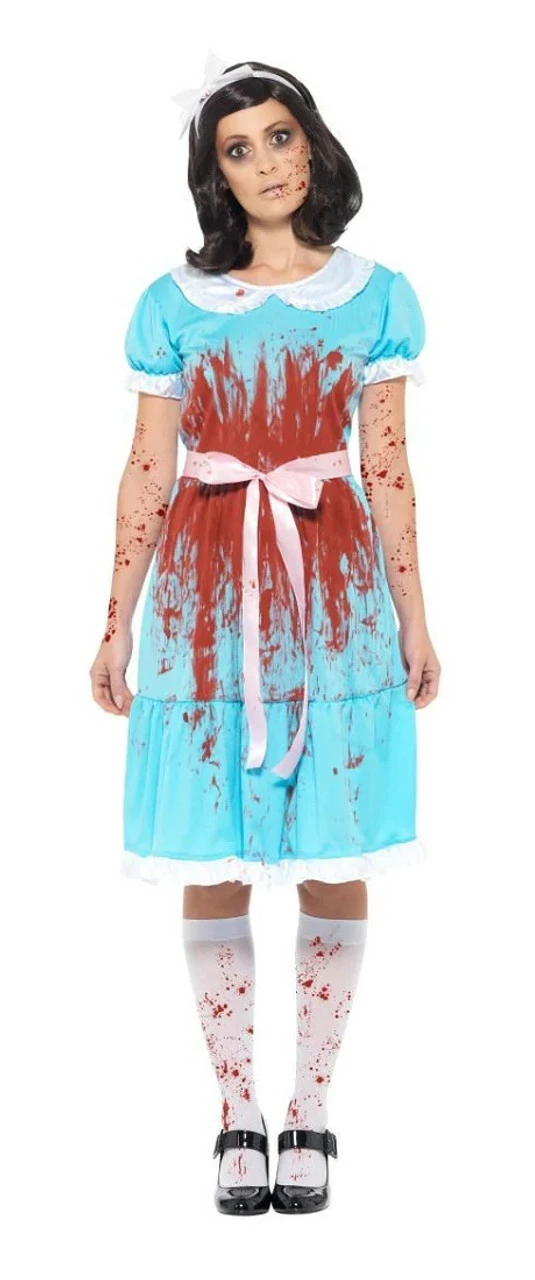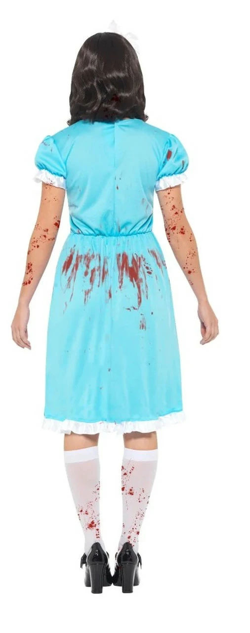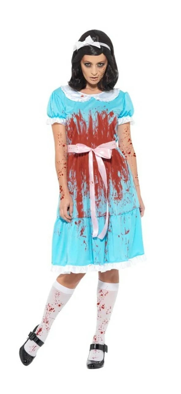 Get your sister or a best friend and step into the shining to terrify your friends this Halloween! Why not dress up as the classic terrifying twins? Bloody Twin Women Costume features blue dress with a white bow and white lace details on the collar, trim and sleeves. The dress also has blood splatter details on the front and back. This costume is complete with a pair of bloody white socks and a white headband.