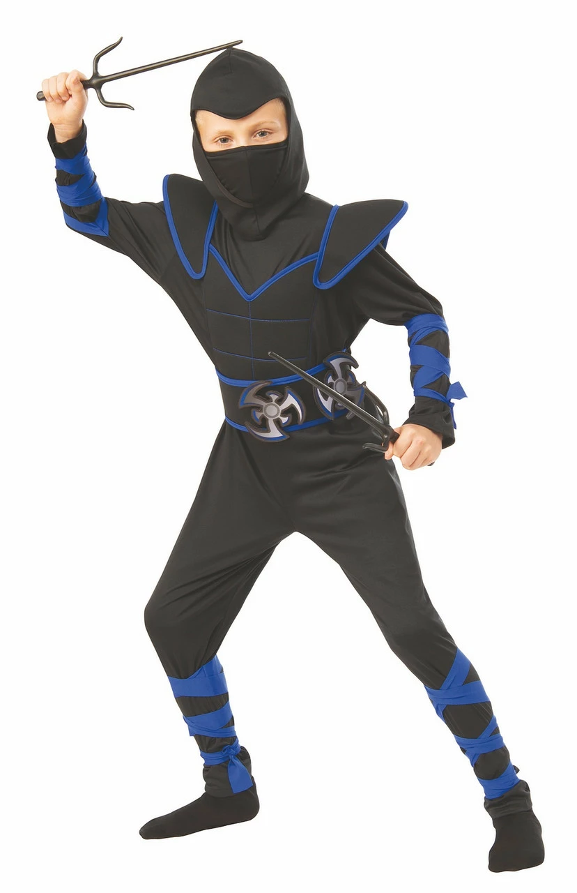 No one will hear you sneaking up to them in this super stealthy Blue Ninja Costume! It features a black jumpsuit complemented by bright blue trimmings and blue ties on the arms and legs. The look is completed by the hood and face mask, the wide belt and the two toy throwing stars. Add a ninja weapon (not included) to fully play the part!