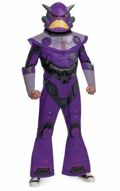 Be Emperor Zurg this Halloween! This Officially licensed costume from the Pixar film Lightyear is the perfect costume! it features a purple jumpsuit that shows off Zurgs robotic details. The pants are flared to give dimension to the costume along with the padded wrists and a collar. The character mask of Zurg completes the look.