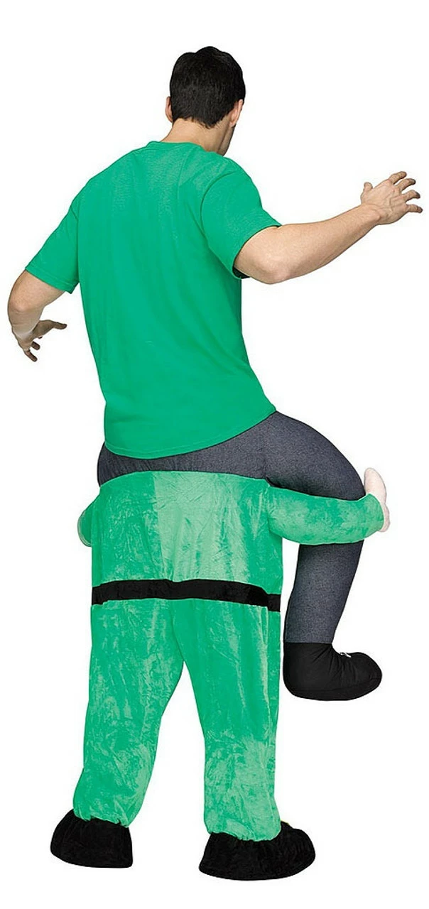 Are you ready for Saint Patrick ’s Day? This Carry Me Leprechaun Adult Costume will be perfect for an unforgettable party! It features character pants that with attached legs that will make it look like a jolly green leprechaun is carrying you on his shoulders.