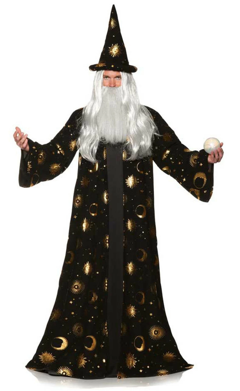 Cast spells and charm those around you this Halloween season in the Celestial Wizard Man Costume! This magical costume features a floor-length regal black tunic with gold sun and moon print and long-sleeves. It also comes with a matching pointed hat, so you can be the most enchanting person at the party and bewitch the night away!Â