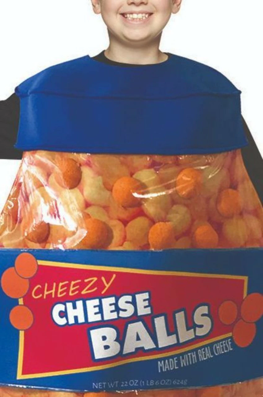 Time to get cheesy! Dress up as delicious snack with this Cheese Balls Child Costume. It features a tunic with a photorealistic picture of a cheese balls container. Complete it with a puffy orange wig (not included) for a super cheesy look!Â