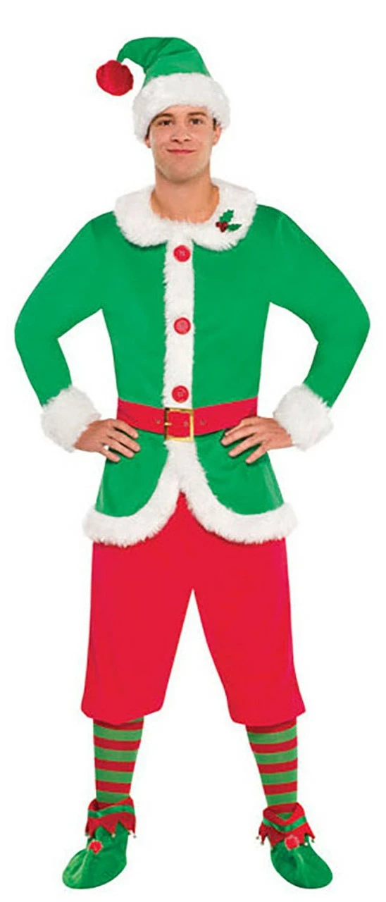 Merry Christmas! Get ready for the happiest time of the year with this Adult Elf costume, which features a green jacket with a white-faux fur trim and mistletoe embroidered on the side of the collar, a matching green elf hat with a white faux-fur trim and a red pompom, a red belt with a thin gold buckle, short red pants, and red-and-green striped socks.