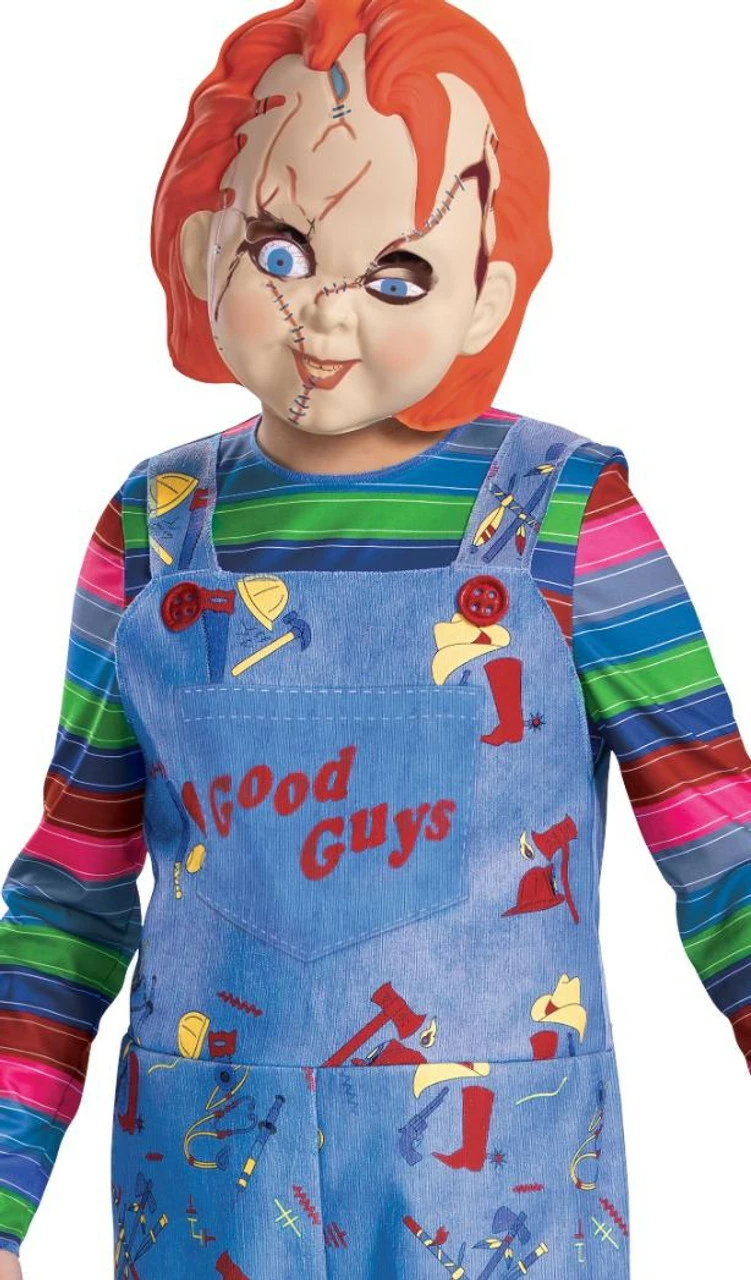 Here is an authentic Chucky costume made to fit a child. Let Chucky scare the wits out of friends and neighbors. Can Chucky be your friend till the end? The Chucky Classic Boy Costume features a jumpsuit styled to look like overalls with striped shirt. The Overall is blue with colored patterns all over it and the logo “Good Guys” in red on the front pocket. The mask has a flesh toned face with textured scar details painted red with black stitching details. It features painted blue eyes and a grinning mouth with teeth with a cut out opening for the eyes.