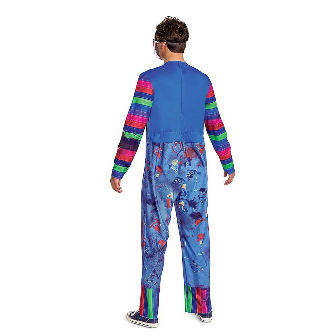 Whether you are attending a costume party or scaring trick or treaters, this Chucky Adult costume will do the trick. Relive one of the most scary movies in cinema and be the killer doll that is a kid’s best friend forever. This officially licensed costume features a jumpsuit styled to look like overalls with striped shirt. The Overall is blue with colored patterns all over it and the logo “Good Guys” in red on the front pocket. The included molded plastic mask has open eyes and elastic band around the back of head. The Wanna play?