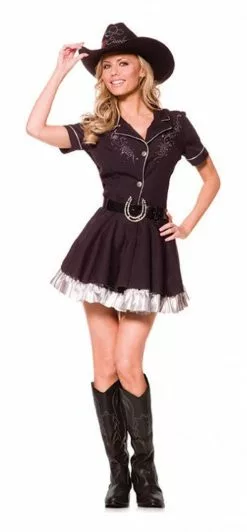 Giddy-up! Be prepared to be turn heads in the Wild West in this Cowgirl Rhinestone Woman Costume! It features a brown breasted dress with a white outline on the sleeves and collar, as well as rhinestone detail on the shoulder and buttons on the front. The skirt of the dress features a white petticoat, and the costume includes a black belt with a rhinestone horseshoe buckle and a matching cowboy hat with rhinestone detail. Yeehaw!Â