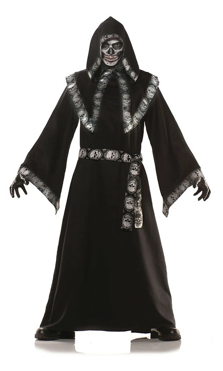 Need a spooky Halloween costume? Look no further than this cool Crypt Keeper Costume! It features a full length tunic with a skull printed jacquard trim, an attached shawl and hood, and a matching belt.