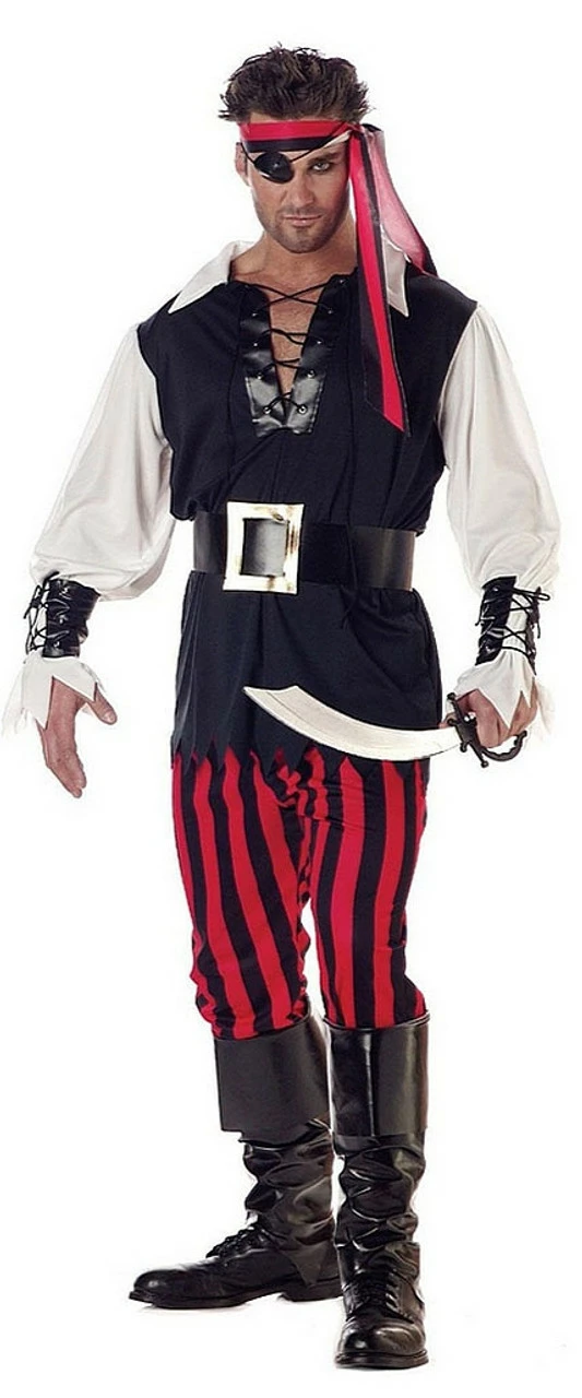 Yo ho, Yo ho, have a pirate’s life this Halloween in this Cutthroat Pirate Men costume. Bring them all to Davy Jones’ Locker with a swish of a blade. This costume is dashing with a black & white shirt and vest. The black and red striped pants is definitely character. Arrr! Be the fearsome and sexy pirate this Halloween.