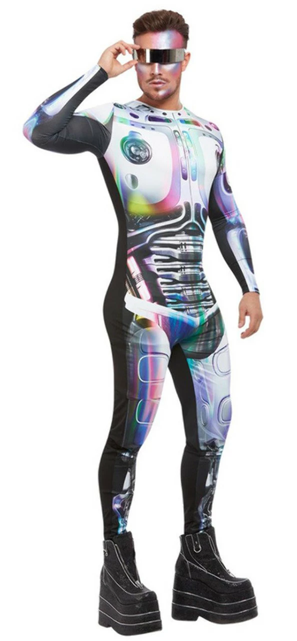 Rule the universe with this stunning Cyber Space Alien Men Costume! This out-of-this-world costume includes a long-sleeve printed metallic bodysuit with silver and multicolor detailing. Turn heads at the party in this galactic get-up and rule the galaxy in style!Â