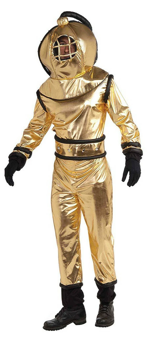 Are you an explorer at heart? Do you long to discover the secrets of the sea? Suit up with this Deep Sea Diver costume featuring a golden, metallic jumpsuit, a matching belt, and an old fashioned diver’s soft helmet with a see-through grate.