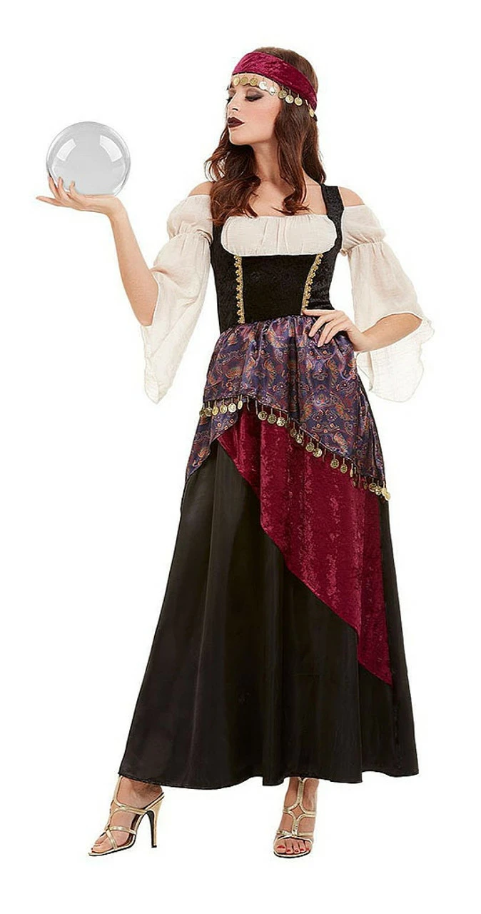 I see a fantastic Halloween night in your future! Dress up as fortune teller with this beautiful costume which features a long black dress with gold detailing and colourful skirt layers and a matching red headscarf with a golden coin trim.