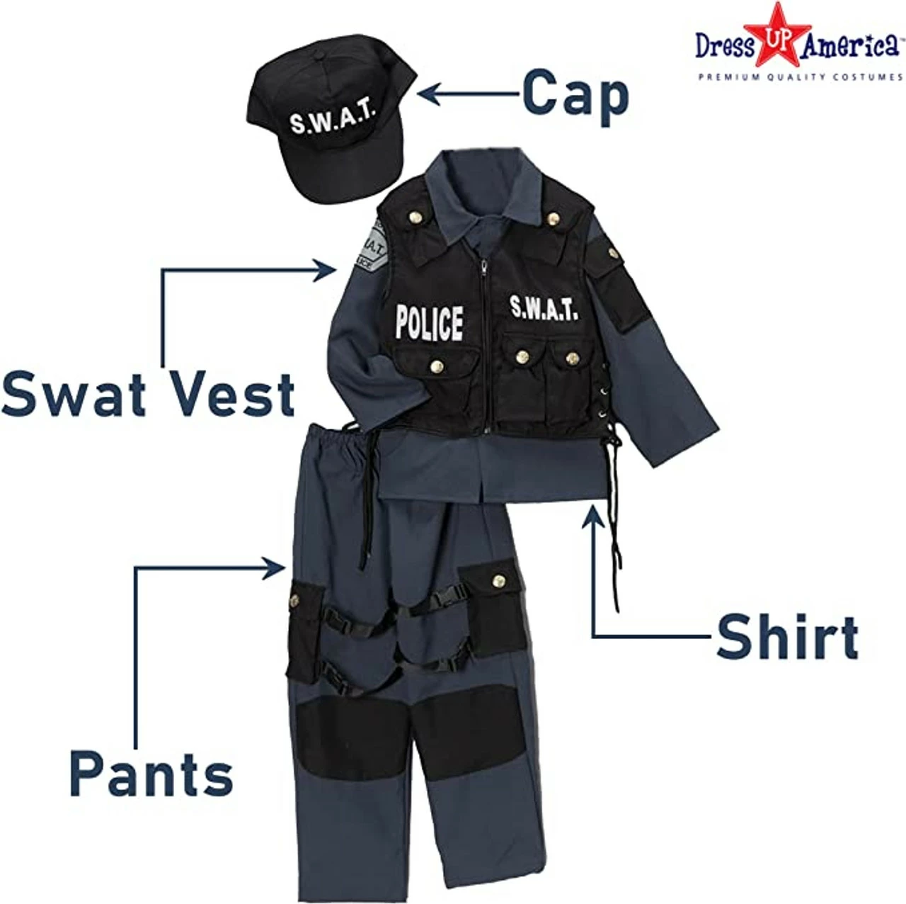 Criminals will not even think of coming to the party as your little one will be constantly on the watch as guardian of justice in the Deluxe S.W.A.T. Costume Child. The navy blue shirt has a classic uniform cut and comes with police emblem on the sleeve. The matching pants also have a classic uniform cut. The SWAT vest and with SWAT print cap complete the classic look.