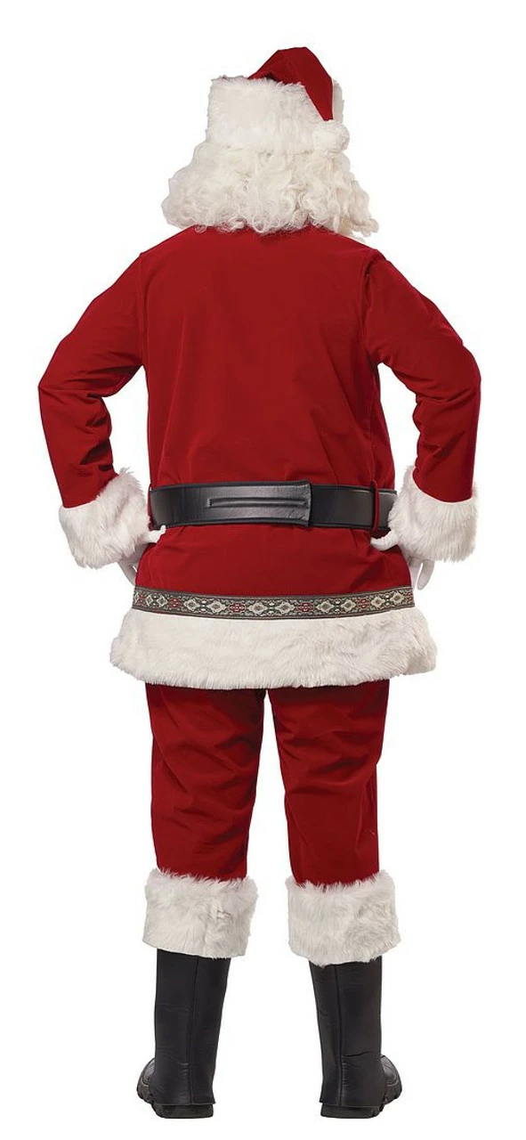 Rock around the Christmas tree in this Deluxe Santa Claus Set Men Costume! Celebrate in style with this festive costume which includes a red deluxe velvet jacket with white faux fur trip trim, and multicolor embroidered band, red matching pants and a thick black belt with a gold buckle. Bring joy to little kids while wearing Santa’s iconic red hat, along with boot covers to transform any shoe into his iconic black boots. The costume set also includes a wig, a beard, a moustache, the white gloves the belly stuffer and of course Santa’s glasses to complete Santa’s look! Just add the bag and spread Christmas cheer this holiday season in this amazing festive costume! The Deluxe Santa Claus Set Men Costume includes:Ā