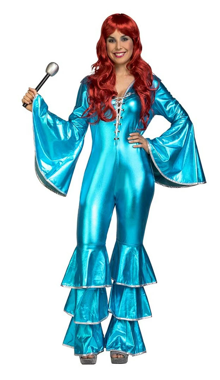 Put on your boogie shoes and groove the night away in this Disco Boy Woman Costume! This costume features a jumpsuit with a lace-up front and bell-bottom sleeves. The pant legs also feature a layered bell-bottom look at the ankle, perfect for getting your funk out on the dancefloor. Pair it with a groovin’ wig and a microphone and you’re ready to sparkle like a star!Â