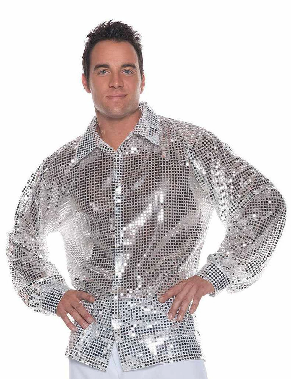 Shake it! Groove it! Hold your breath for a retro and nostalgic night in this Disco Silver Sequin Glitter Shirt. Exciting and far out costume featuring a silver, glossy long sleeve shirt that will make all the babes rock! Add our disco platform shoes, disco flare pant and an Afro wig for the total look.