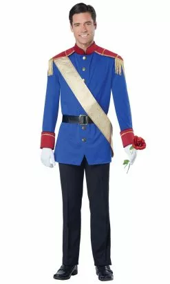 Everyone will sure be preparing for your arrival when you put on this Storybook Prince Charming Costume! This noble outfit features a blue, button-up jacket with red cuffs that match the color of the stand-up collar and the pattern of the included epaulets. It also includes a gold mettalic sash with an elegant brocade pattern and a black belt with gold square buckle to make this outfit look better. This Storybook Prince Charming Costume is a perfect outfit to wear if your intention is to impress.