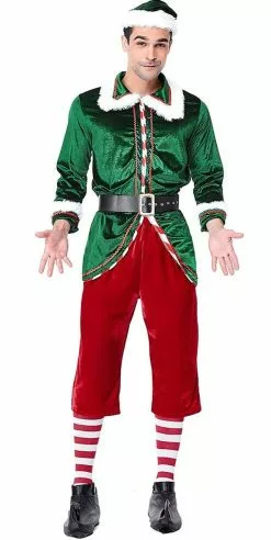 Are you looking for a festive men’s elf costume? Be the best elf there is with this men’s elf costume featuring a full outfit with a detailed green jacket, red pants, stockings with a candy cane design paired with an elf hat belt and boot covers you will be ready for your next event!Ā