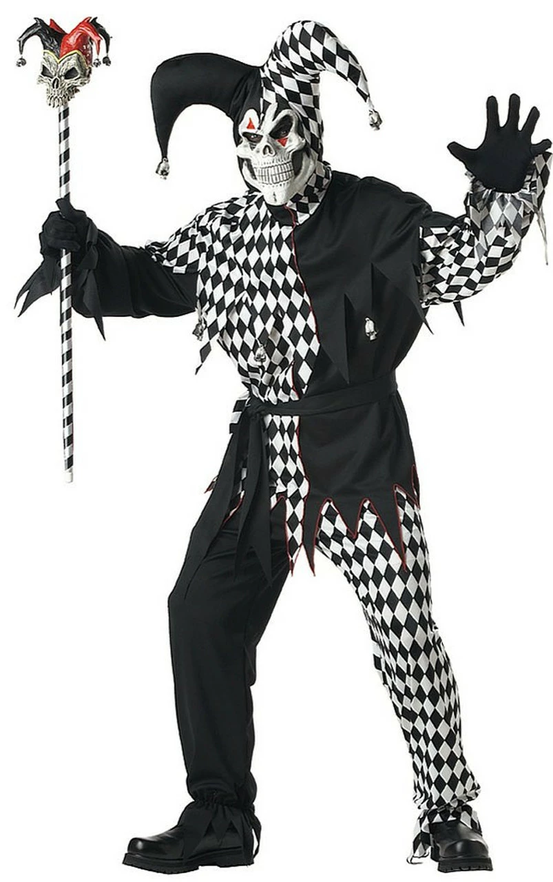 Bring on evil spirits with this tongue-cheek Evil Jester Adult Costume. Behind the mask, you can be smiling, but the mask will give the impression of an evil scowl. The Evil Jester Adult Costume features the shirt with skulls, the coordinating pants and a waist sash. Thankfully, the Evil Jester Adult Costume also includes the all-important headpiece and mask. Now come on and add your own spirit. This costume is begging for a little personal interpretation.