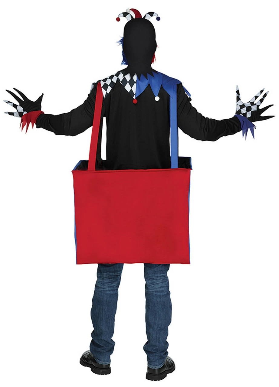 Pop goes the freak in the box! This Halloween dress up as a childhood favorite! Freak In A Box Adult Costume features a red and blue boxed tunic with 4 panels on the front red and blue with black stars and striped and whimsical checkered patterns. The long sleeve shirt has a spring printed on the front to give the illusion that your head is springing out of the box! The collar matches the patterns on the box with matching gloves and a terrifying mask and attached jester hat to complete the look!