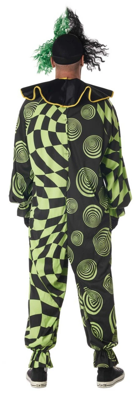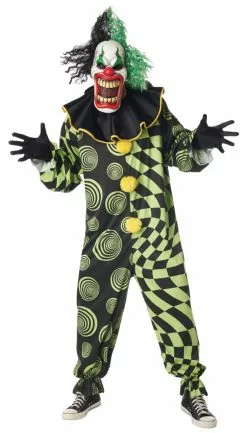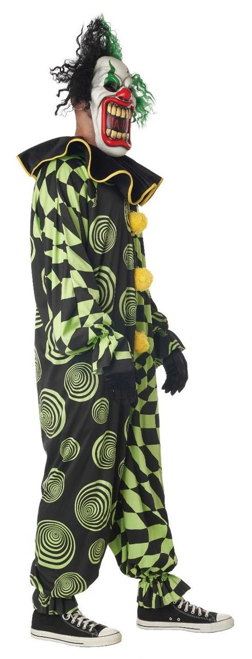 There is no need to shout boo on this Funhouse Freak Clown to get screams. The Costume features a black and green long-sleeved jumpsuit with psychedelic prints. The jumpsuit is adorned by a large black collar with yellow trimmings and 3 yellow pom poms. The mask with big teeth and standout hair completes the freak look of this Funhouse costume. Match this Funhouse Freak Man Costume with an evil laugh and have a blast.