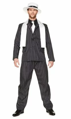 Become your city’s boss of gangsters and the richest of them all in in this Gangster Mob Boss Men Costume! This classic costume features a pinstripe button up jacket with faux pocket details and attached white handkerchief. It includes black and white matching pinstripe trousers with elastic waist and a white satin thick gangster scarf. No gangster costume will be complete without its hat, this one is made from white padded foam with a wire brim edge and black ribbon. This super costume will be perfect for a 20’s themed party or many other events!Â