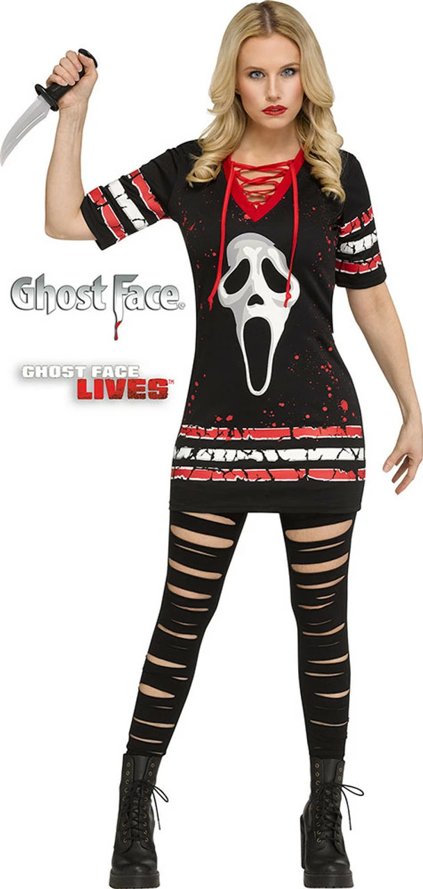 Do you like scary movies? You will love the Ghost Face Dress Adult costume! This officially licensed Ghost Face costume features a long jersey t-shirt dress with red and white tattered stripes, blood splatter, the classic ghost face icon on the front and a red lace up chest to add to this edgy look. The back is complete with the words “Ghost Face” and number “96” the year Ghost Face first made an appearance in the classic films.