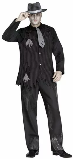 A Ghostly twist on a classic 1920s costume! Ghostly Gangster Adult Costume features a black shirt with an attached striped vest. The vest is tattered with grey gauze fabric and a matching grey tie. The black scruffy pants and black gangster hat with silver detailing complete the look.