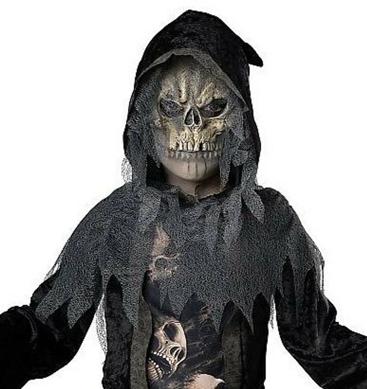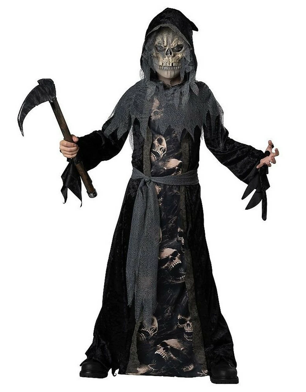 Get ready to reap as much candy as you can this Halloween! This Grim Reaper Kids costume will be the perfect horror costume to spend the night trick-or-treating. It features a hooded black velveteen floor length robe with printed skulls in the middle. The sleeves are tattered so is gray collar who comes in the same fabric as the waist tie. The skull mask will complete this scary look and you will be ready to spread the fear wherever you go.Â