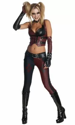 Bring to life part of the fictional Arkham City and bring maddening mayhem at the next party as the dark Harley Quinn. The Arkham City Harley Quinn Adult Costume will transform you for the night into the dark humoured Joker sidekick tempting everyone to fall to evil’s clutches with your good looks and devilish absurdity. The attractive top will accentuate and reveal your waist and the matching pants with character design will highlight your long and slender legs. The chocker, glovelettes and belt complete the dark character look.