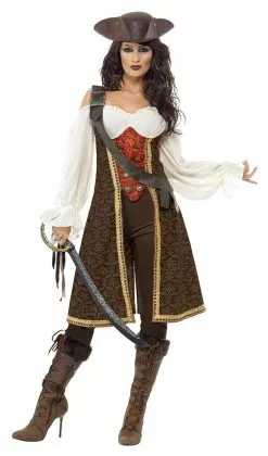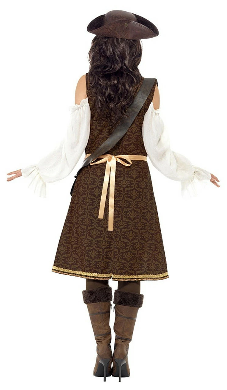 Shiver me timbers! You’ll be the Queen of the High Seas in this cool High Seas Pirate Wench Costume! Follow the footsteps of famous women buccaneers such as Ann Bonny or Mary Read in this costume, which features an off the shoulder dress with a gold trim and corset-like piece. It’s completed by a pair of brown trousers and a baldric.