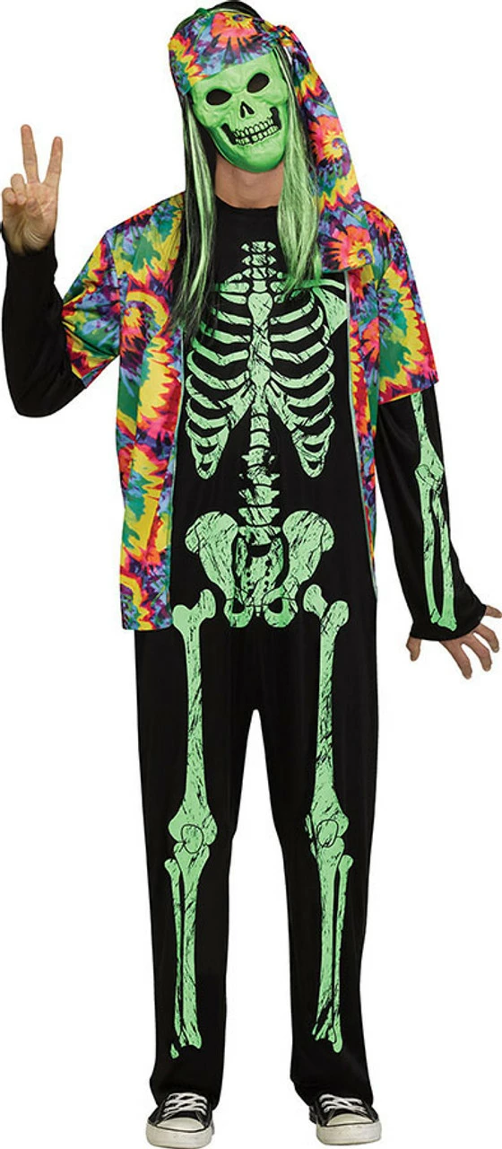 A twist on a classic skeleton costume! This Hippie Dead Adult Costume is sure to bring the peace! The Hippie Dead Adult Costume features a skeleton jumpsuit with a tie dye over shirt and matching bandana. The matching green skeleton mask and attached long wig complete the look.