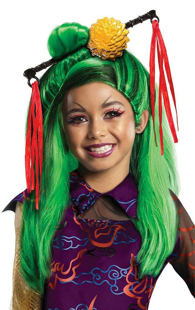 Complete your look for with this stunning Child Wig. Featuring long green hair with black highlights, and a bun in back, it also includes the black rod with gold ornament. This wig completes the look of Monster High Jinafire, an asian costume, a dragon costume or a ninja costume.