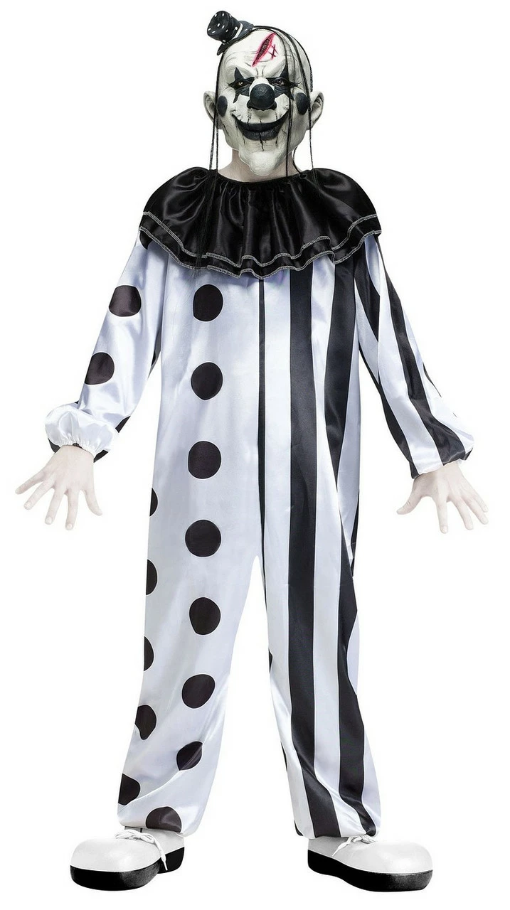 Let your little boy provide a killer fun this Halloween by wearing this Killer Clown Child Costume! This creepy outfit features a black and white jumpsuit with clown-inspired black collar and a terrifying mask. The clown mask features a weird face, sinister smile, an attached hat and a few strands of hair. Your little child will sure get excited to wear this and scare everyone when he receives this outfit!