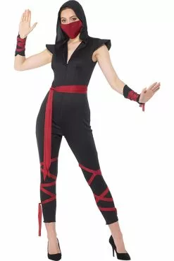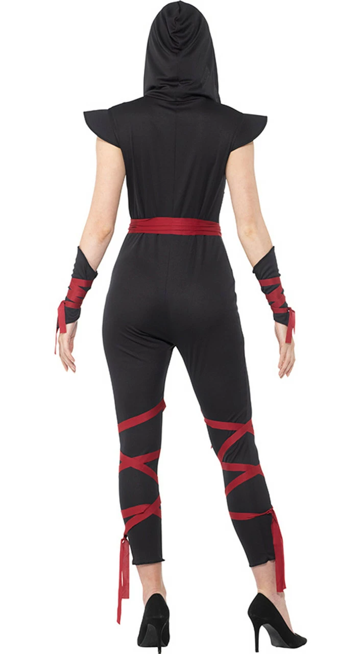 You can kick some serious butt wearing this sexy ninja costume! This sexy costume features a black ninja bodysuit with an attached hood, a V neckline and red leg wrappings, black armbands with matching red wrappings, a red sash, and a red ninja half face mask. Your enemies better watch-out as you’ll be the stealthiest warrior at the party!Â