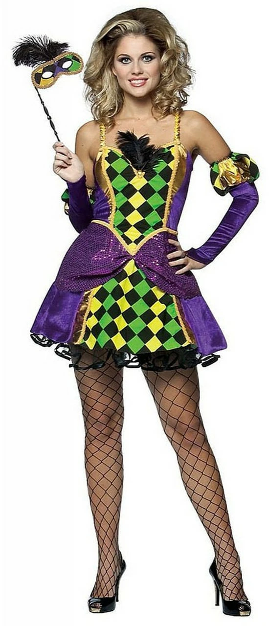 All eyes will be on you thanks to this Mardi Gras Queen Costume! A traditional celebration that marks the beginning of the ritual fasting for Lent, Mardi Gras also has pagan roots. It is celebrated all over the world with colourful, vibrant carnivals, making it the perfect excuse to dress up! This costume is a typical carnival costume, with a brightly coloured sleeveless purple dress decorated with black, green, and yellow checkers, a feather ornament on the bodice, as well as golden accents. The skirt is also decorated with a short, sparkly, purple overlay. The costume also includes matching fingerless gloves that go up to the elbow and feature a puff at the top—they can be attached to your middle finger—and a matching Carnival mask on a stick.