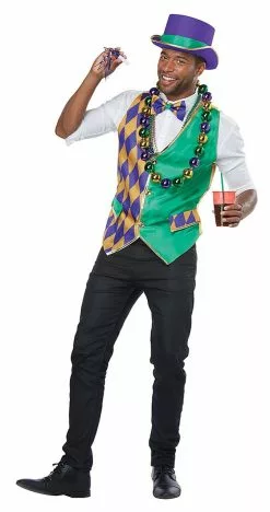 Get ready for Carnival and Mardi Gras with this fun Mardi Gras Vest Men’s Kit! It features a button up vest that’s green on one side and has a gold and purple chequered pattern on the other side. It also comes with a matching bow tie and a purple top hat with a green ribbon and a gold trim.