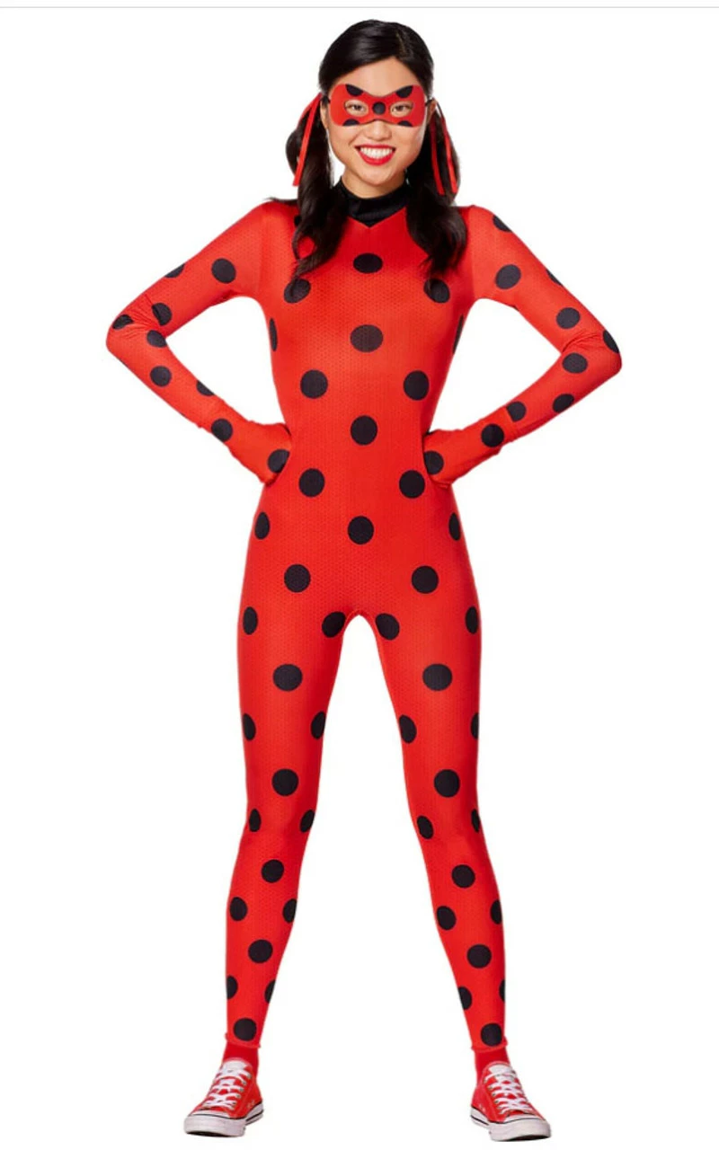 Do you want to be a ladybug this Halloween or a super hero? Why not both? Dress up as Marinette your favorite multi-tasking super hero! You’ll love wearing this officially licensed Miraculous Ladybug Womens Costume! This costume features a red and black polka dot jumpsuit with matching gloves and two hair bands to recreate the iconic pigtail hair style of Marinette and a matching eye mask to complete the look.