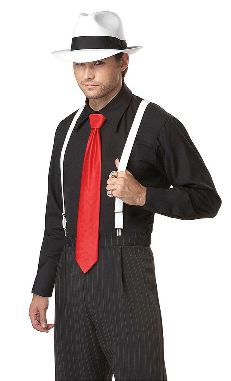 Bring back the air of the old gangster movies and become the dark and alluring figure of the evening with the Mob Boss Costume. The costume follows the cut of old gangster members with lean cuts and large shoulders. The jacket comes with matching straight pants, black shirt and attractive red silky looking tie. The suspenders give an additional feel to the costume. Add a dark and inquisitive expression and you will definitely send out a couple of chills. To complete the look, check our gangster hat, machine gun and gangster moustache.