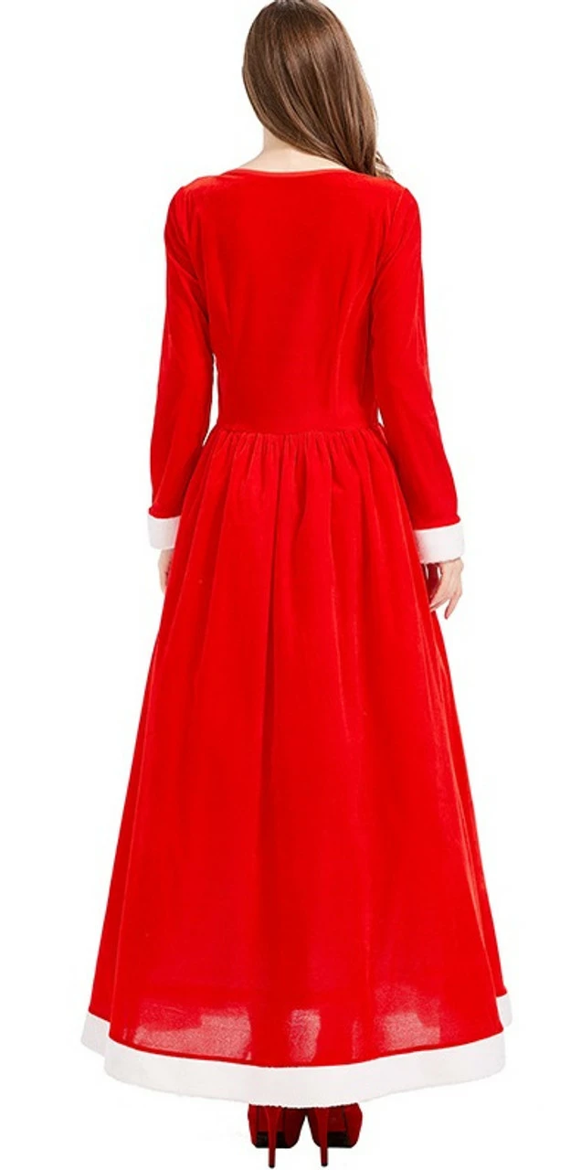 Show up in style in this fancy attire! Featuring a long red sleeve dress with a faux fur white trim and matching cape with strings and attached pom poms to secure the cape, the attached hood completes the look. Perfect for winter parties and parades!