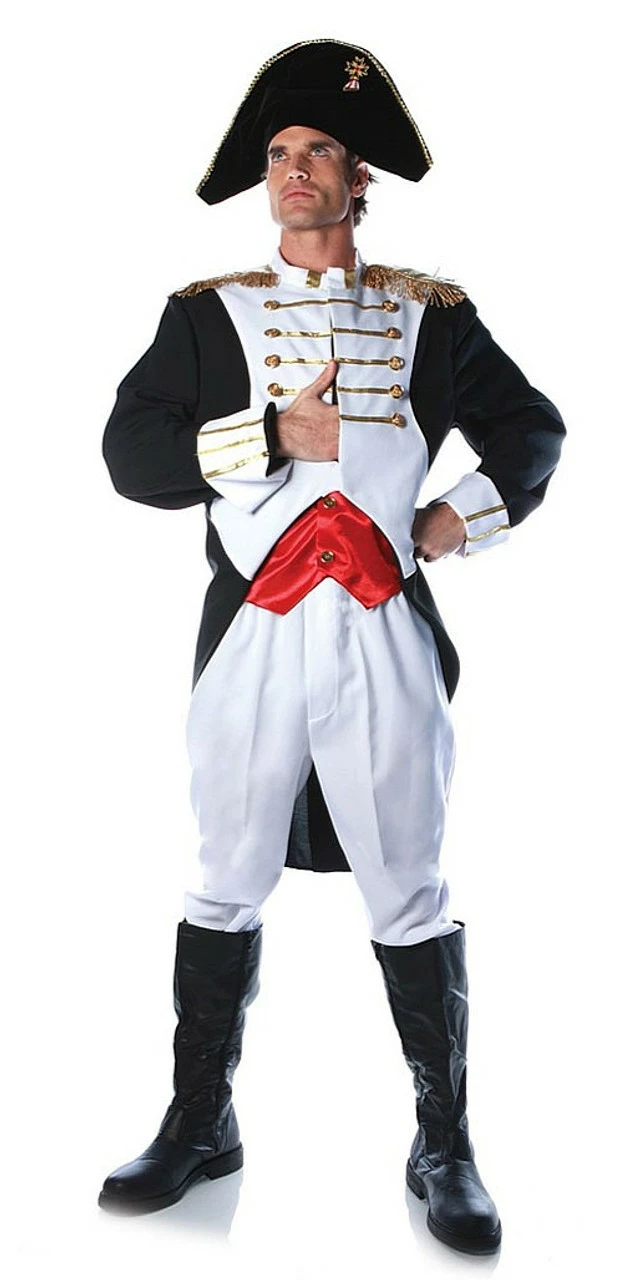 Conquer the party in the Napoleon Costume. The military style jacket with an attached red vest are based on one of the familiar images of Napoleon. The white pants create the perfect silhouette with the matching boot cuffs. The iconic hat completes this historical image.