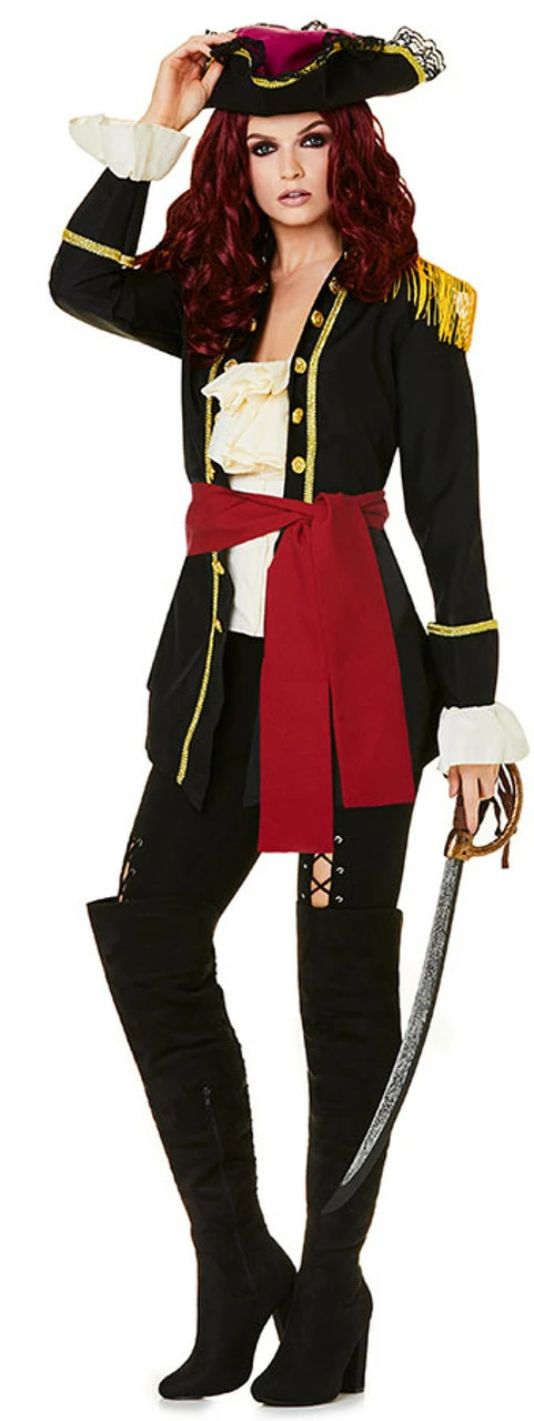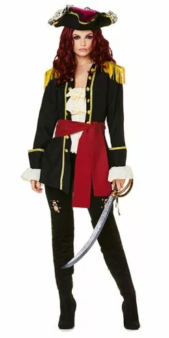 Be a classy shipmate in this Pirate Captain Women Costume. The costume feature a beautiful black jacket with gold trims and buttons, as well as epaulets with fringes on the shoulders. The jacket also has a white shirt insert in the front and ruffles on the sleeves. A a red sash and a beautiful black tricorn with gold and lace trims complete the look that’s sure to add a dash of flirt to the festivities. Shiver me timbers!Â