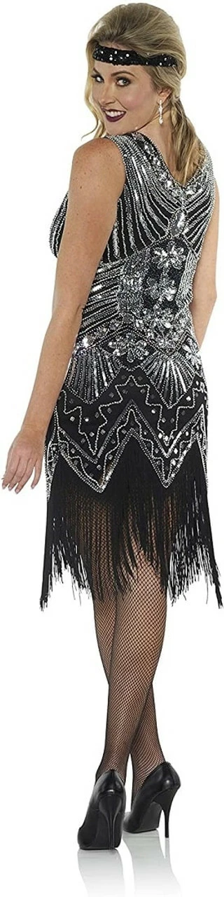 Wow everyone at the party with this beautifully intricate Platinum Beaded Dress Costume! This silver and black flapper dress features stunning beaded detail (on the front and the back!) and a black fringe trim. Add accessories (not included) to complete the look!